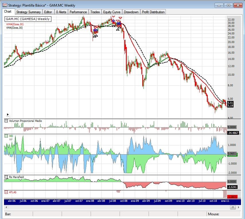El indicador Manipulación, si lo que dice es cierto, estaría mostrándonos que las manos fuertes han acumulado bastantes títulos y que en estos momentos estarían dejando de comprar. Esto podría significar que hay posibilidades de que la tendencia cambie de bajista a alcista, pero cuidado, de enero a abril de 2009 también lo parecía y siguió cayendo, por lo que nunca debemos anticiparnos a un cambio de tendencia, esto solo debe servirnos para tenerla en seguimiento.