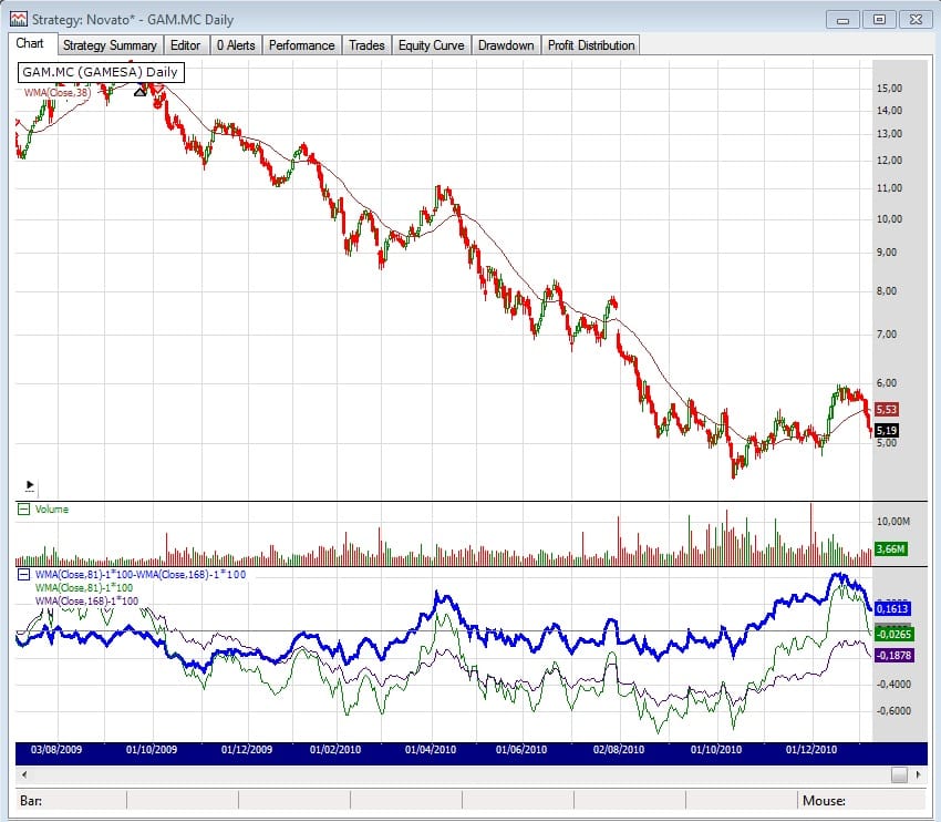 En el indicador, la linea azul oscuro indica la aceleración del valor. Como veis, últimamente estaba por debajo de cero, lo que indica que se estaba frenando, salvo los últimos días que se ha vuelto a poner por encima. El sistema Novato lleva largo desde 2,43 y el stop loss actual lo tiene en 3,06.