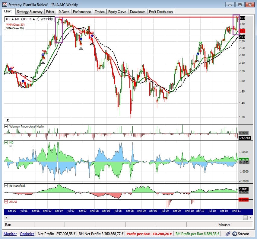Al margen de la fortaleza del valor, que es alcista, etc. Yo no voy a decir que si recorta a la media móvil es compra como han dicho varios de mis compañeros. Y lo digo porque este arreón al alza tan vertical me recuerda enormemente al final de la subida que hubo en abril de 2007, además está justo debajo de su máximo histórico por lo que primero debería superarlo para tener una subida libre, sólo entonces me plantearía comprar, aunque con muchas reservas ya que Iberia es muy traicionera. Sea como sea, SIEMPRE, un stop os salvará de enganchadas.